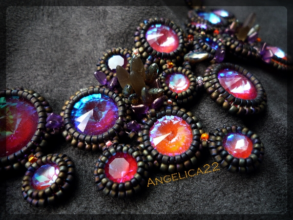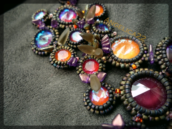 Die Steine hab ich beim Perlentreffen vor eineinhalb Jahren zusammengekauft und noch alles aus dem Fundus dazu genommen, was ins Farbkonzept passte. Und dann Fassungen gebaut, eine ums andere.