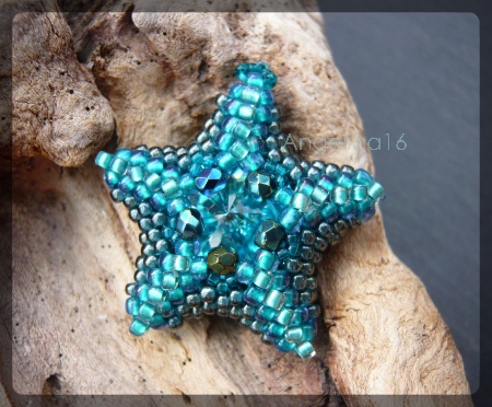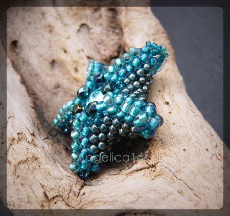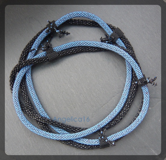 ich bin kein Blaufan, aber als ich die Matsunosrocaille in die Finger bekam, da wußte ich, diese Blau muss man für sich stehen lassen. Und da liegt sie nun, ganz in blau. Eine weitere Häkelkette aus schwarzmatten gedrehten Tohohexen an der Seite. Und die Verbindungen sind mit winzig kleinen Tentakeln belegt. Für den optischen Stolperstein.