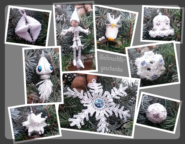 Es ist ja praktisch, wenn man schöne Sachen fädeln kann, macht immer was her. Meiner Mutter schenke ich jetzt seit einigen Jahren immer etwas gefädeltes, immer in weiss, da unser Familienbaum von jeher weiss ist. Inzwischen schmücken die "beaded Gifts" ein extra Adventsgesteck. Und jedes Jahr vergesse ich die Fotos. Aber diesmal hab ich beim Frühstücksbrunch dran gedacht.