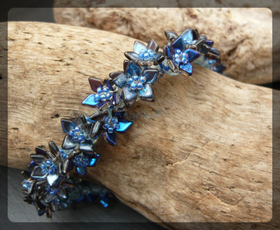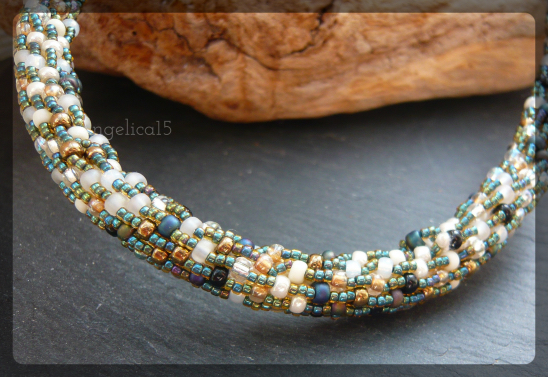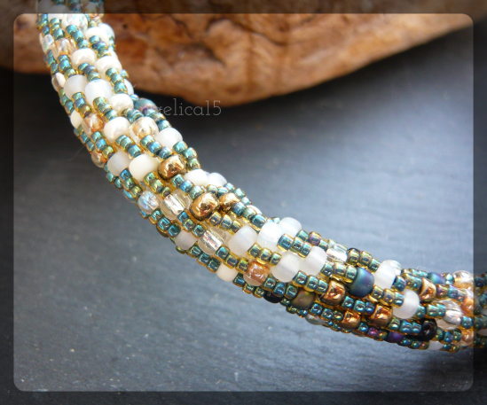 Und so eine Farbe darf einfach nicht Ton in Ton sein, deshalb dazu Toho 950 und 85. Ich hab etwas modifiziert und mich für ein Armband entschieden, als Kette wäre das nix für mich gewesen.