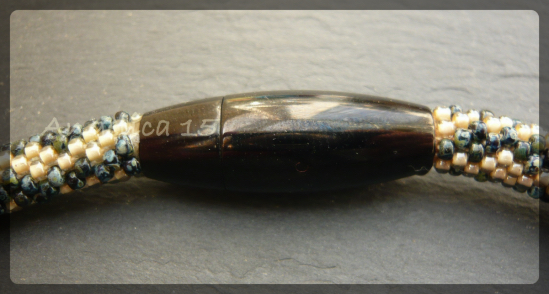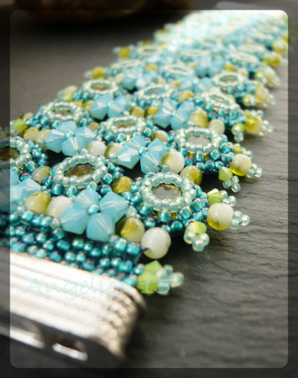 die türkisen Chatons in der Mittelreihe kommen übrigens daher, das die angegebene Menge 14 cm Länge ergeben hätte. Aber Khaki hatte ich nicht mehr, deshalb hab ich die Indigoliths mit reingenommen.