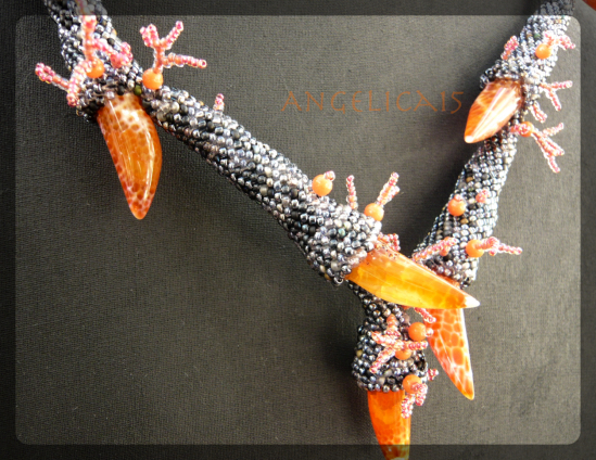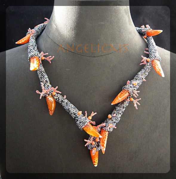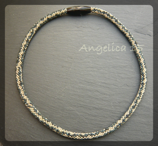 Am Anfang stand die Kette einer Russin, die in gehäkelte Ketten Löcher eingehäkelt hatte, in die dann runde Kugeln eingefädelt wurden. Letztes Jahr hab ich mir dann im Oktober zum Jahresurlaub eine Suppe angesetzt aus Hematit, Hybriden,  Jet Azzuro, und anderen wunderbaren dunkelgrauen Farben. Und dann im Urlaub drauflosgehäkelt. Allerdings hatte ich da noch die Idee, Korallenäste zu bündeln und danach einzufädeln ( kommt vielleicht noch) oder aus Polymerclay was zu basteln. Und dann kam ich aus dem Urlaub zurück mit der Kette, drei Tüten lang ( der Urlaub war voll gewesen) und der Zufall kam mir Hilfe. Bei Etsy hab ich diese Achatzähne entdeckt, gekauft und - als sie kamen- eingepasst. Sah genau richtig aus. Und dann halt wieder ein bisschen gehäkelt und so weiter und so fort. Und als alles fertig war, wirkte es doch ein wenig .... TUSK.