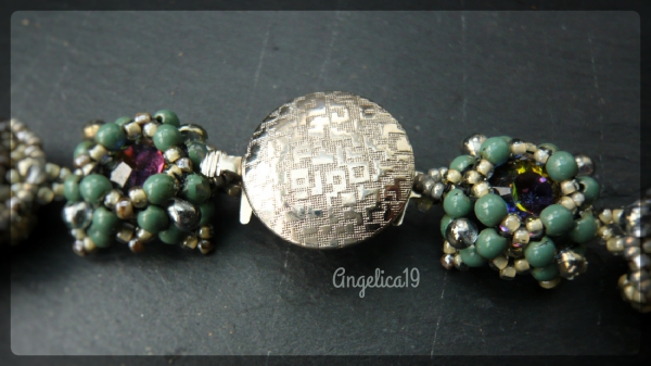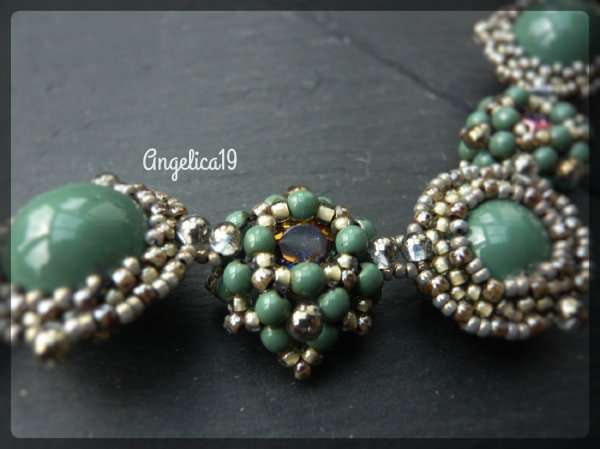 Und da ich diese runden Perlen in Hartford Green dazu verwendet hab, dachte ich, das wäre eine klasse Idee, die passenden Domebeads zu verwenden, dann sind die endlich weg. Das war ein Fehlkauf, das einzig Schöne ist die Farbe. Bei der Gelegenheit hab ich festgestellt, das es die Dinger in zwei Größen gibt, das war mir bis dahin nicht aufgefallen.