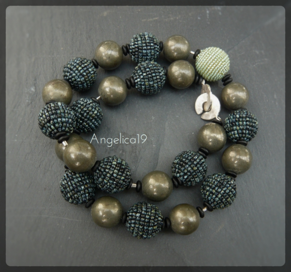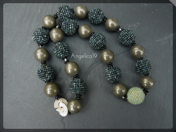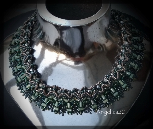 Zudem hatte ich schon seit Jahren die Vorstellung ein mehrlagiges Collier zusammen zustellen, da bot sich die Aztek als Basis an. Ich hab dann erstmal mit St.Petersburg darunter gefädelt und dazu analog dann oben noch eine Lage . Das musste allerdings auf der Büste gefädelt werden, damit die Rundung a Hals stimmt, sonst hätte sich das Ganze aufgestellt. Aber so ist gut.