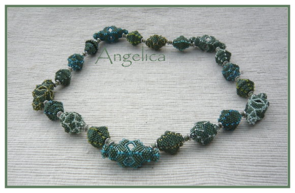 das letzte Ebook von Judith Bertoglio-Giffin hat ja das Thema Circus. Eigentlich als einzelne Armreifen gedacht, habe ich doch wieder eine ganze Kette gemacht und dabei die ganzen Restbestände verwerten können, die beim Abzählen der tschechischen Perlen im Shop immer so übrig bleiben. Ich habe 11er Rocailles statt der Medium Delicas verwendet, und statt schwarz - weiss - bunt habe ich matt weiss - matt hematit - grün/türkis/hellblau genommen, also, wie immer, genauso, aber anders.
