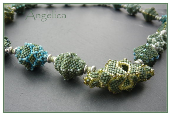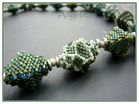 eine Beaded Beads aus Vintage Doppelpyramiden, ein Versuch, es mal anders rum zu fädeln.