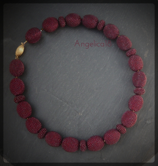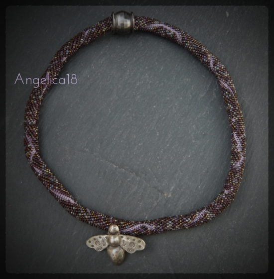 Judith aus Israel hat diese Kette in der Netztechnik zuerst gezeigt. Meist war sie mir viel zu bunt, da wirkte sie oft sehr kindlich. Karneval sah ich sie mal in einer monochromen Variante, die Anleitung hatte ich schon seit Jahr und Tag ohne je reingeguckt zu haben, also schnell gefädelt, ein Silberschloß dran gemacht und als Variation eine Hera und eine selbst geschusterte Perle drangehängt.