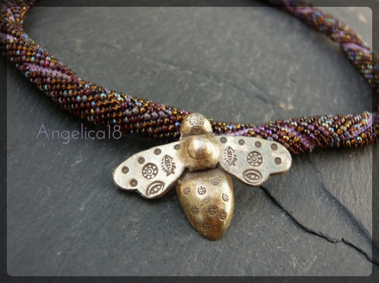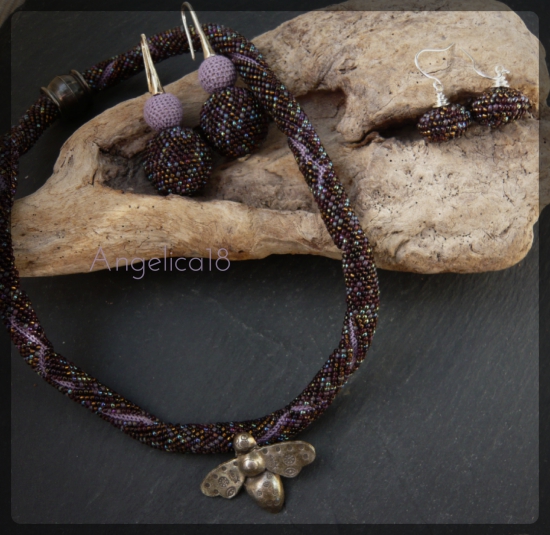Hier eine Kette gehäkelt, mit Fliegenflug als Nichtspur. Und einem Silberinsekt. Und weil ich grade noch Perlen auf dem Garn hatte, wurden noch zwei Ohrhänger gehäkelt, einmal Uih, einmal harmlos.