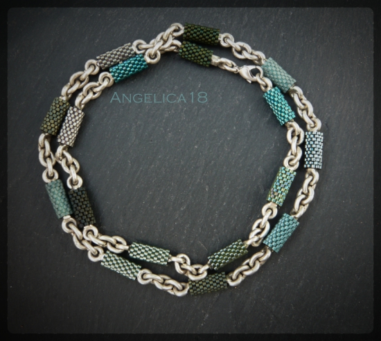 beim Aufräumen fielen mir auch noch einige massive SterlingSilber Ketten und Armbänder in die Hände, aus Goldschmiedezeiten. Zwar massiv und gut gearbeitet aber irgendwie langweilig. Die erste Kette ist jetzt offiziell gepimpt mit Zylinderperlen.