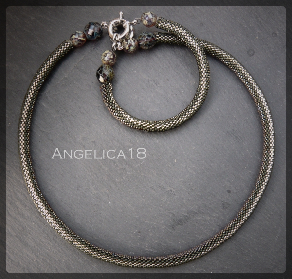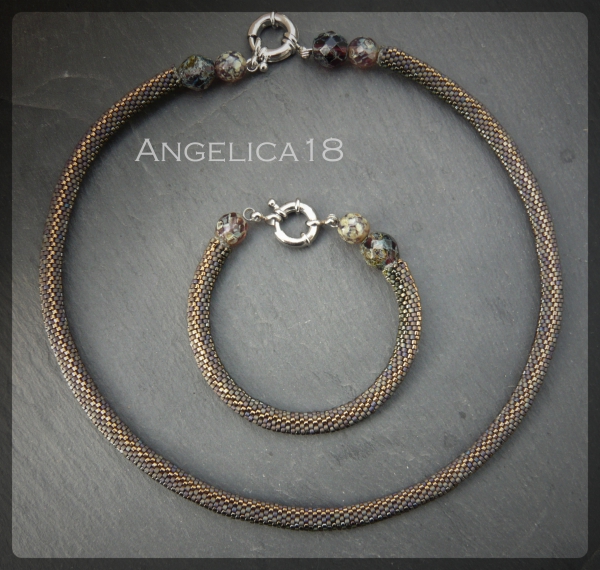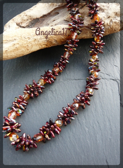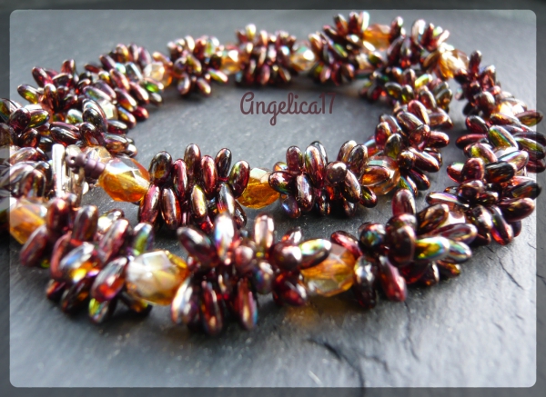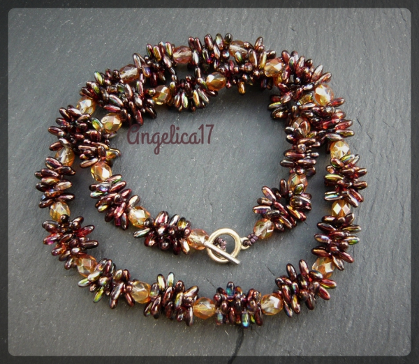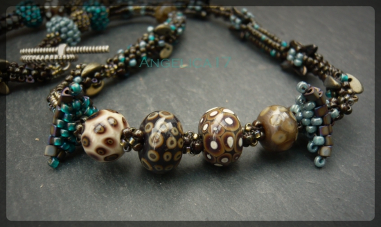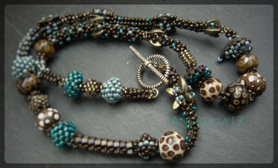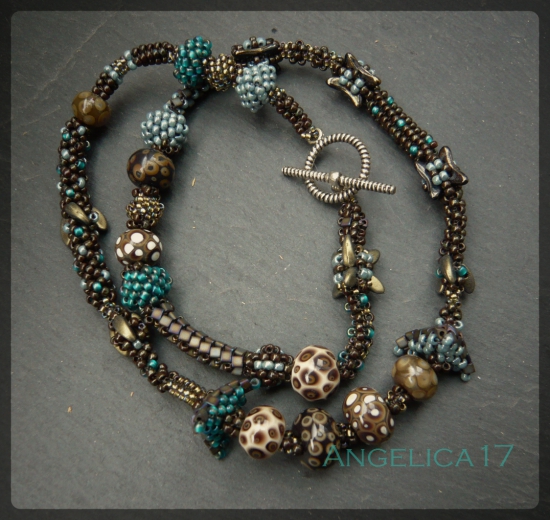 ich hab noch so viele Lampworks, die sind sicherlich jetzt so acht , neun Jahre her. Und zu schade zum rumliegen. Und jetzt habe ich die mit den tschechischen Hybriden in Braun und ganz viel Inspiration von meinem Lieblingsbuch Bead Play Love zu einer kleinen, feinen Kette gefädelt.
